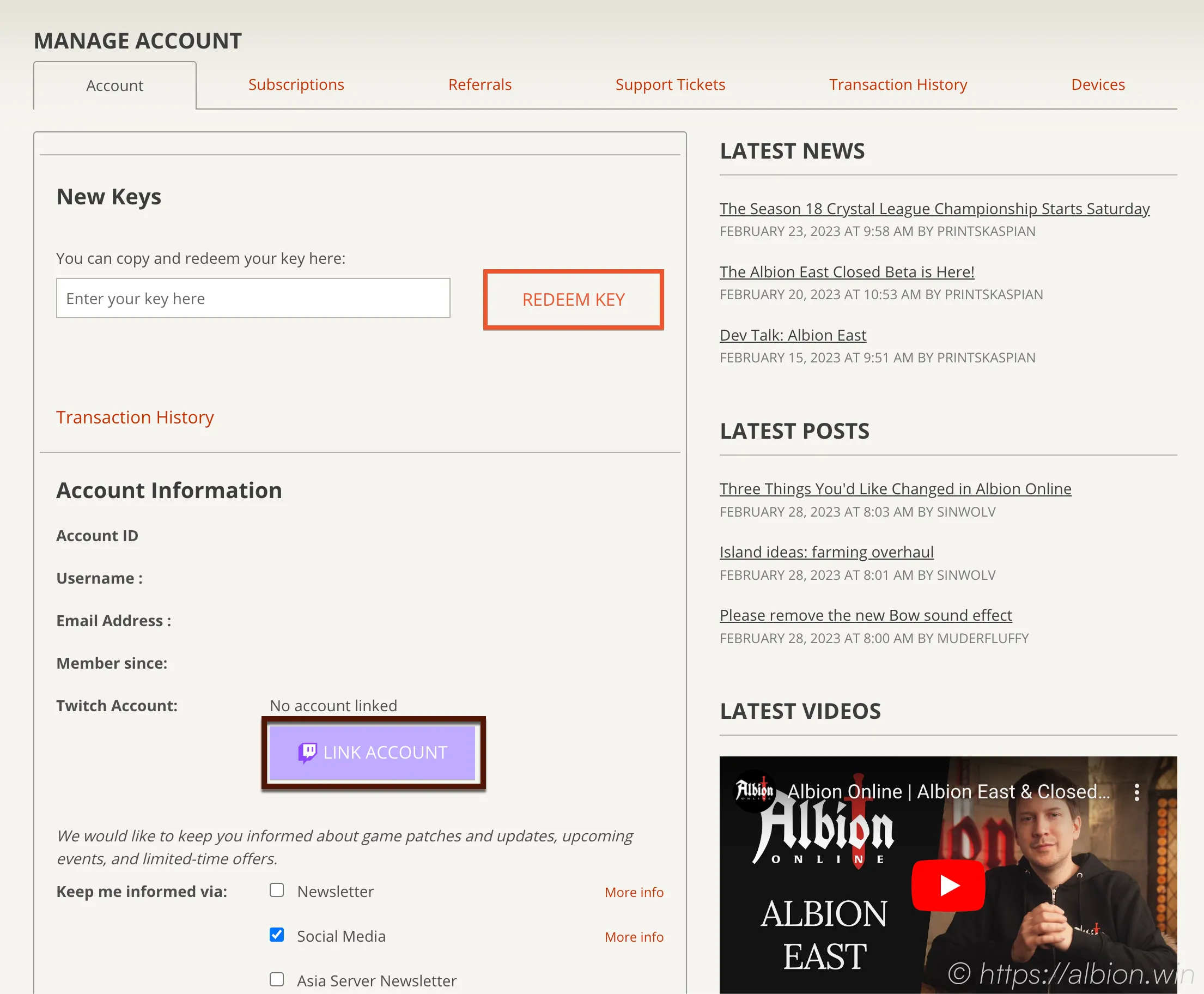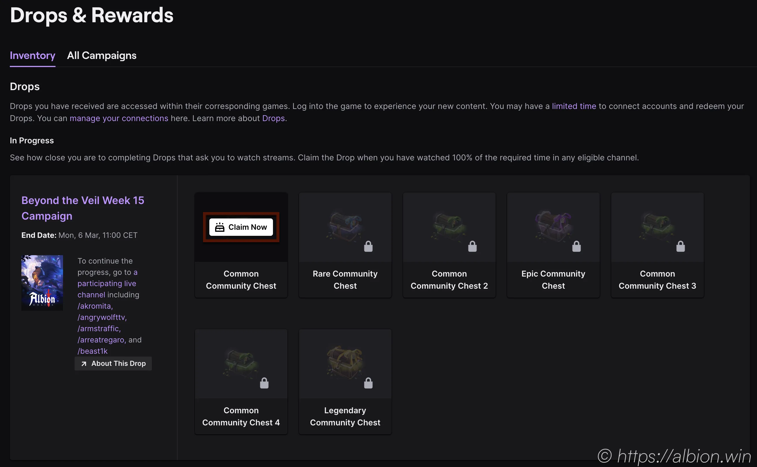 - Check our Chapter on Link your Twitch and Albion Account to receive Drops . You can see it on your Account Page.