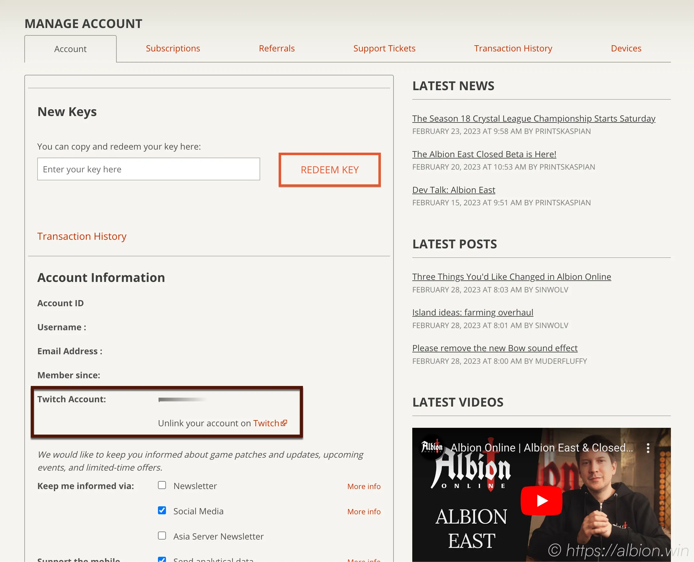After this step was successfully completed, you will be sent back to the MANAGE ACCOUNT page of Albion Online. Here you can now see to which Twitch Account you are linked. The information there should match your Twitch Account!