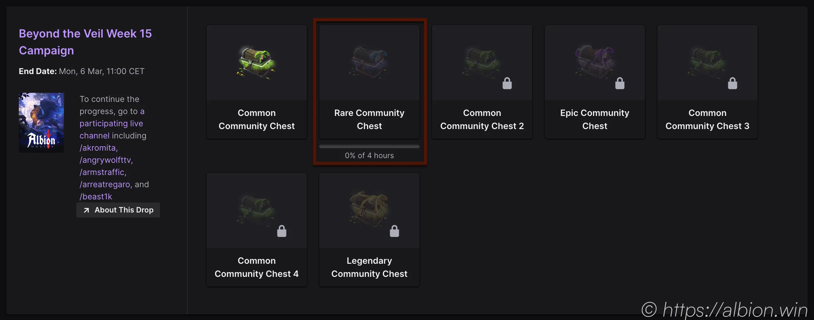 Here you maybe have to scroll a bit to find Albion Online, but there you can see the rewards you can earn. Currently (March 2023) there are 7 chests you can earn each week. Each of these chests rewards some different random community reward.