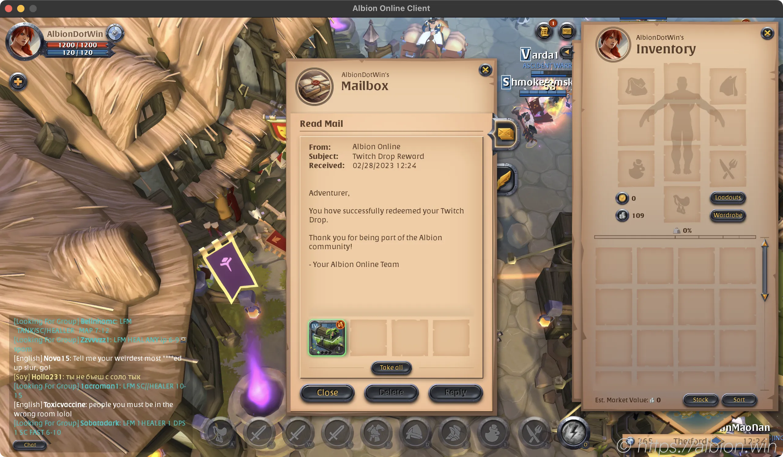 Upon opening the Twitch drop reward mail from Albion Online in your mailbox, you will be presented a chest. To claim the chest, simply select the “Take All” option and the items will be transferred to your inventory in-game.
